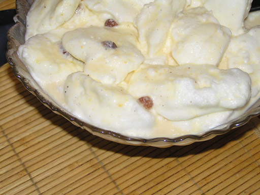 A tojásfehérjékből - 1 kávéskanál porcukorral - verjünk kemény habot. A tej felét forraljuk fel, egy evőkanállal a tejbe a felvert tojásfehérjéből galuskákat szaggatunk, kb. 1 perc múlva megfordítjuk őket, majd következő 1 perc múlva szedjük ki szűrőkanállal a megfőtt habfelhőket egy tálba. Ezután öntsük hozzá a tejhez a másik felét is és forrásig melegítsük. A tojássárgákhoz keverjünk 5 evőkanál cukrot, 1 evőkanál lisztet és egy csomag vaníliás cukrot. A tejből tegyünk 1-2 evőkanálnyit a tojássárgás keverékhez, azzal hígítsuk, és úgy öntsük hozzá a tejhez, kevergetve, hogy ne csomósodjon. Szórjuk bele a mazsolát és a reszelt citromhéjat és állandó kevergetés mellett várjuk meg míg kissé besűrűsödik. Öntsük egy tálba, tegyük rá a habfelhőket, várjuk meg míg kihűl és tegyük be a hűtőbe, mert hidegen fogyasztva az igazi.
