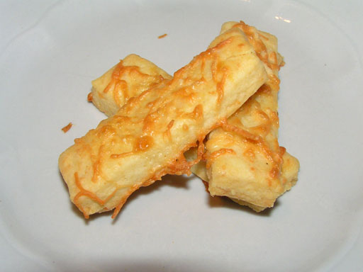 A lisztet a sütőporral összekeverjük, majd a margarinnal elmorzsoljuk. Belegyúrjuk a reszelt sajtot (pár dekát félreteszünk amit majd a tészta tetejére szórunk) és a sót. Ujjnyi vastagságúra kinyújtjuk, a felvert tojássárgájával megkenjük, majd megszórjuk a reszelt sajttal és egyenlő hosszúságú rudacskákra vágjuk. Sütőben középső rácson 180 fokon kb. 15-20 percet sütjük.