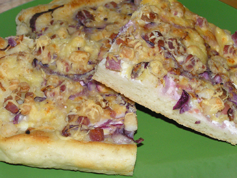 A krumplit meghámozva, felkockázva sós vízben megfőzzük. Közben az élesztőt 2 dl langyos vízben csipet sóval és cukorral hagyjuk felfutni. A megfőtt krumplit összetörjük, hozzáadjuk a lisztet, a megfuttatott élesztőt, az evőkanál olajat és a kávéskanál sót, összedolgozzuk és tésztává gyúrjuk. 1 órát kelesztjük meleg helyen, ha jól dolgoztunk kb. a duplájára nő majd. A kész tésztát sütőpapírral bélelt tepsibe tesszük és vizes kézzel belenyújtjuk a tésztát, villával megszurkáljuk, és 180 fokon 10 percig sütjük. Közben a hagymákat megpucoljuk; a fokhagymát apróra vágjuk, a vöröshagymát félbe és vékony szeletekre vágjuk. Felkockázzuk a szalonnákat, lereszeljük a sajtot. A fokhagymát összekeverjük a tejföllel és rákenjük a sütőből kivett tésztára, majd rászórjuk a hagymaszeleteket és a felkockázott szalonnát végül beborítjuk a reszelt sajttal is. Visszatoljuk a sütőbe és 180 fokon még 15-20 percig sütjük. Ha kész kockákra vágjuk, melegen tálaljuk.